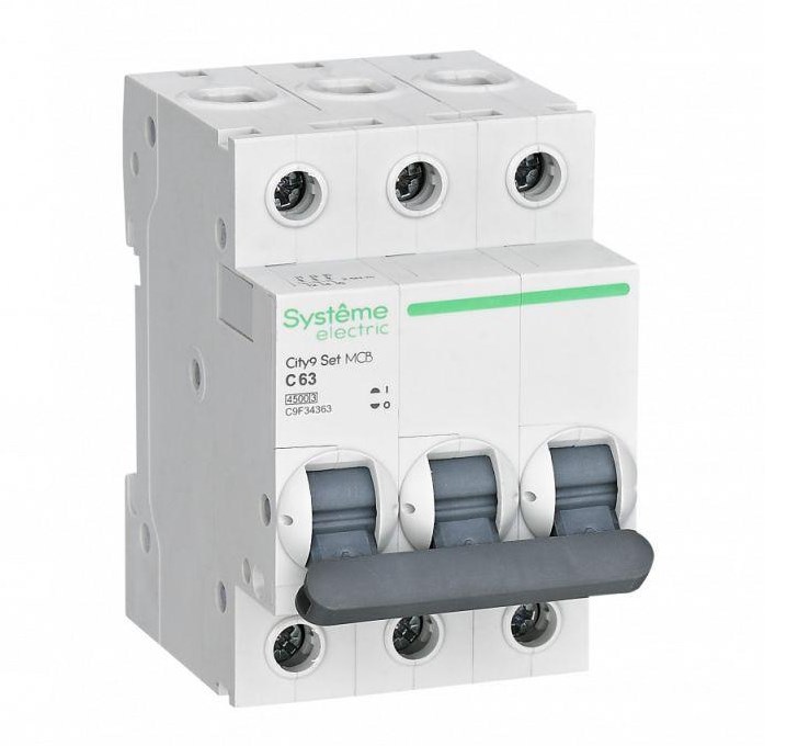 Автоматический выключатель серии City9 Set Systeme Electric, 3-полюсный, номинальный ток 63 А, характеристика С, Icn = 4.5 кА. Применяется в электрических сетях напряжением 400 В. Предназначен для защиты от перегрузок и токов короткого замыкания. Оснащен механизмом «мгновенной коммутации». Ударопрочный корпус из специального пластика с 6 металлическими заклепками. Безопасные клеммы исключают попадание кабелей в заклеммное пространство.