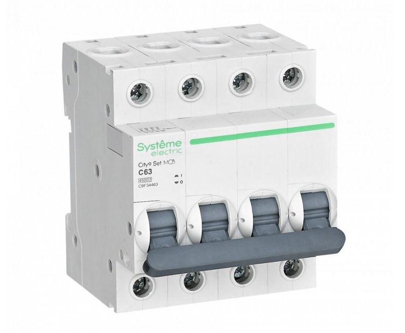 Автоматический выключатель серии City9 Set Systeme Electric, 4-полюсный, номинальный ток 63 А, характеристика С, Icn = 4.5 кА. Применяется в электрических сетях напряжением 400 В. Предназначен для защиты от перегрузок и токов короткого замыкания. Оснащен механизмом «мгновенной коммутации». Ударопрочный корпус из специального пластика с 6 металлическими заклепками. Безопасные клеммы исключают попадание кабелей в заклеммное пространство.