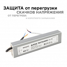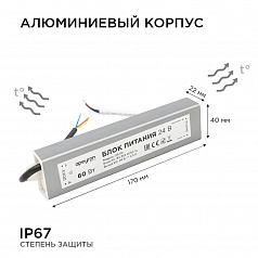 Блок питания 24В 03-112 из линейки Стандарт с номинальной мощностью 60Вт обладает на выходе постоянным током с напряжением 24В, что делает его идеальным источником питания для таких изделий, как светодиодная лента, светодиодные лампы, линейки и модули с рабочим напряжением 24В. Компактный, алюминиевый корпус с размерами 170х40х22мм позволит найти место для монтажа в любом интерьере, спрятать в местах с ограниченным пространством. Также он будет легок в подключении благодаря проводам с цветовой маркировкой и обозначениям на корпусе. Кроме всего прочего этот блок питания, благодаря входному фильтру, будет работать при скачках напряжения в диапазоне 85-264В, в то время как выходной фильтр сглаживает пульсацию и защищает ваши глаза. Данный блок питания имеет самую высокую степень защиты от пыли и влаги IP67. Такие блоки питания могут выдержать даже кратковременное погружение под воду, и именно их рекомендуется использовать в тех местах, где есть высокий уровень воздействия влаги и вероятность попадания воды.