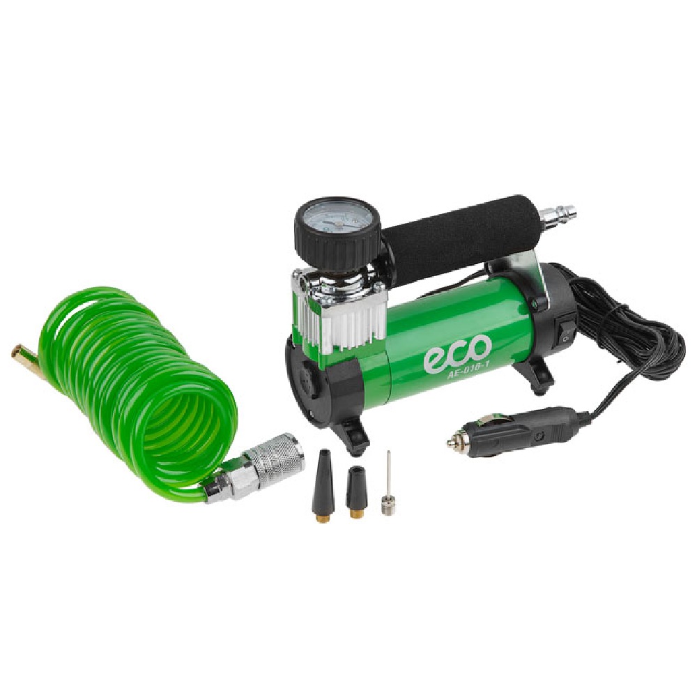 Автомобильный компрессор ECO 12151 AE-016-1 имеет двигатель со 100% медной обмоткой, который обеспечивает гарантированно высокий ресурс устройства, стальной поршень с подшипником, быстросъемный коннектор для выходного шланга, спиральный шланг 3 м в комплекте. Время накачивания колеса 195/65/R15 до давления 2 бар - 3-4 мин.