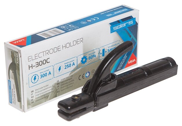 Электрододержатель SOLARIS H-300С предназначен для подачи тока на электрод в процессе сварки. Держатель применяется с электродами диаметром 1,6 - 5 мм и рассчитан на эксплуатацию при силе тока 250 А, но способен максимально выдерживать ток силой 300 А. Рекомендуется использовать с кабелем не менее КГ 1х25.