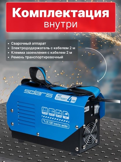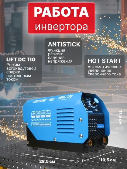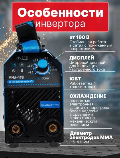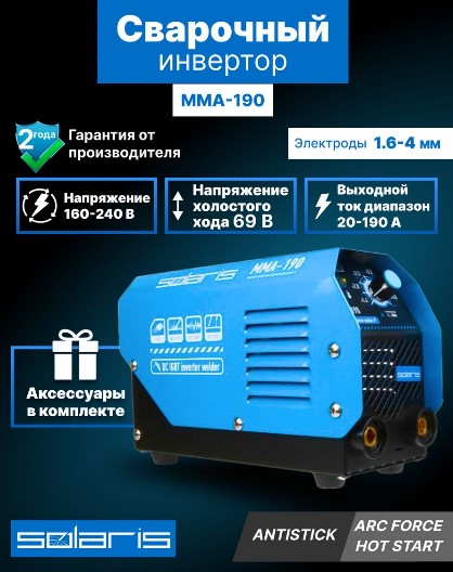 Инверторный сварочный аппарат Solaris MMA-190 - компактный инверторный сварочный аппарат, позволяющий варить в режиме ручной дуговой сварки.