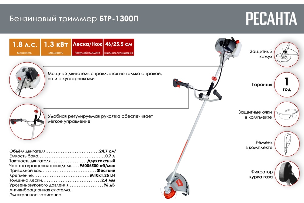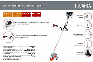 Триммер бензиновый БТР-1300П Ресанта - надежный инструмент для скашивания травы. Представляет собой современный вариант традиционного для этого вида работ ручного инструмента - косы. Часто дачники отдают приоритет этой бензиновой модели, ведь не на каждом участке есть электричество, а провода создают дополнительное неудобство. Мощность триммера позволяет снимать высокую траву и кустарники.