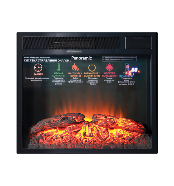 Эффект горящих дров, созданных по слепку с настоящих. Прямое стекло. Регулировка яркости пламени и дров (5 режимов), также «АВТО-режим» - возгорание и затухание в автоматическом режиме. Новый обогреватель с функцией «климат-контроль» спрятан в верхней части очага; обеспечивает обогрев в холодную погоду, а самое главное – не сжигает кислород в помещении!