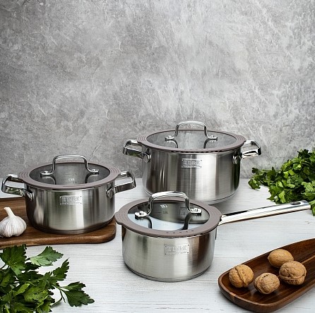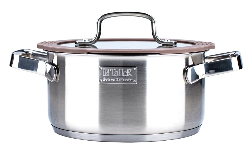 Кастрюля TalleR 17352 объемом 2,1 л изготовлена из нержавеющей стали, железа и алюминия. В дно, толщина которого 4 мм, встроен антидеформационный диск, увеличивающий прочность. Есть внутренняя градуировка, ручки и отверстие для слива жидкости. В комплекте идет крышка с клапаном для выпуска пара. Модель можно нагревать на конфорках разного типа — газовых, стеклокерамических и чугунных, галогеновых и индукционных. Допускается ставить кастрюлю в холодильник, а также мыть в посудомоечной машине.