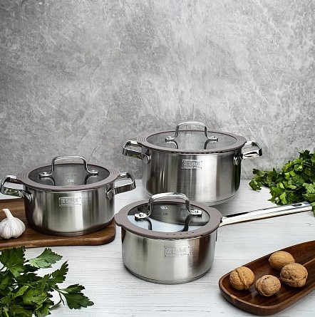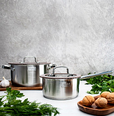 Посуда для приготовления выполнена из нержавеющей стали с высокими антикоррозийными свойствами. При приготовлении блюд посуда обеспечивает равномерное распределение тепла и быстрый нагрев содержимого, избегая пригорания пищи.