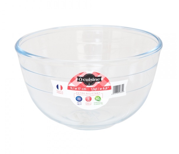 Миска изготовлена из боросиликатного стекла. Этот материал отличается устойчивостью к резким перепадам температуры и к механическим повреждениям (царапины). Посуда при необходимости может использоваться в микроволновой печи, для мытья разрешено применение посудомоечной машины.