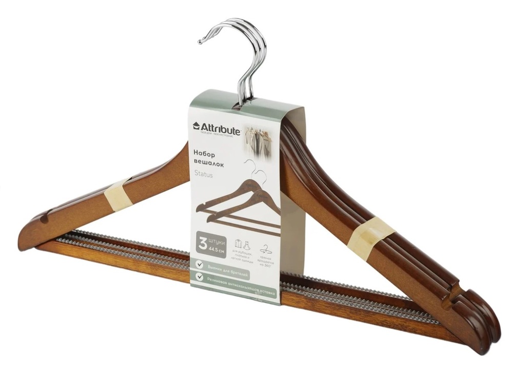 Набор универсальных вешалок Attribute STATUS (3 шт.) — это идеальное решение для организации вашего гардероба. Вешалки изготовлены из натурального дерева, защищены бесцветным лаком и имеют оптимальный размер 44–46 см. Благодаря поворачивающейся ручке из качественной стали, они обеспечивают удобство при размещении вещей в шкафу.