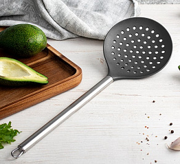 Шумовка Материал: нейлон, нержавеющая сталь. В ручках предусмотрены отверстия для подвешивания. Можно мыть в посудомоечной машине.
