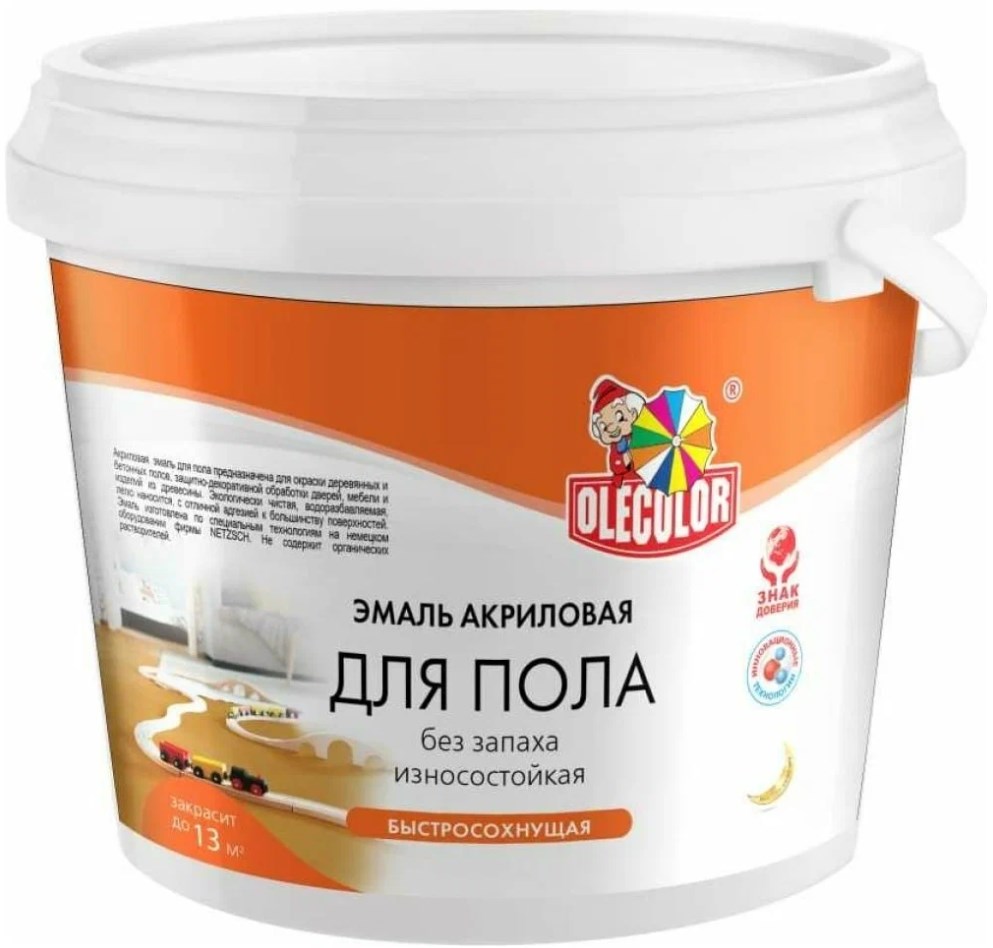 Акриловая эмаль для полов OLECOLOR серый туман, 1 кг предназначена для окраски деревянных и бетонных полов, защитно-декоративной обработки дверей, мебели и изделий из древесины. Используют для внутренних работ. Продукт рекомендуют наносить на основание равномерным тонким слоем при помощи кисти, валика, краскораспылителя. Особенностью покрытия является водостойкость и устойчивость к истиранию (1 класс - менее 5 мкм при 200 циклах истирания). Благодаря составу, эмаль образует ровную, матовую, износостойкую поверхность, абсолютно не токсична, экологически безопасна.
