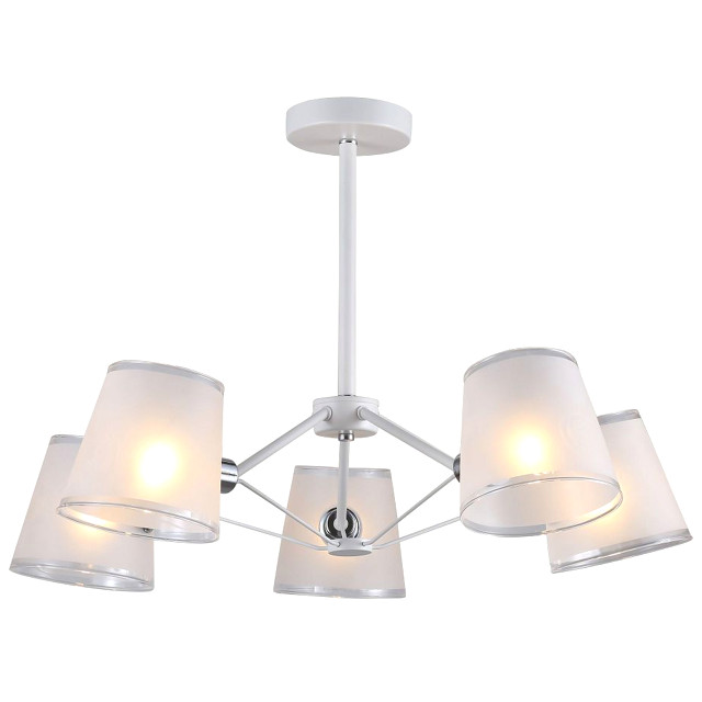 Потолочная люстра коллекции ''Missaggio''. Выполнена из высококачественных материалов и комплектующих. Арматура цвета хром, плафоны - стекло. Люстра состоит из пяти рожков с цоколем Е14. Без ПДУ. Стиль модерн. Имеет возможность использования любых ламп с цоколем Е14 мощностью до 40 Ватт. Люстра проста в монтаже. Прекрасно подойдет для основного местного освещения в гостиных, спальнях и студиях.