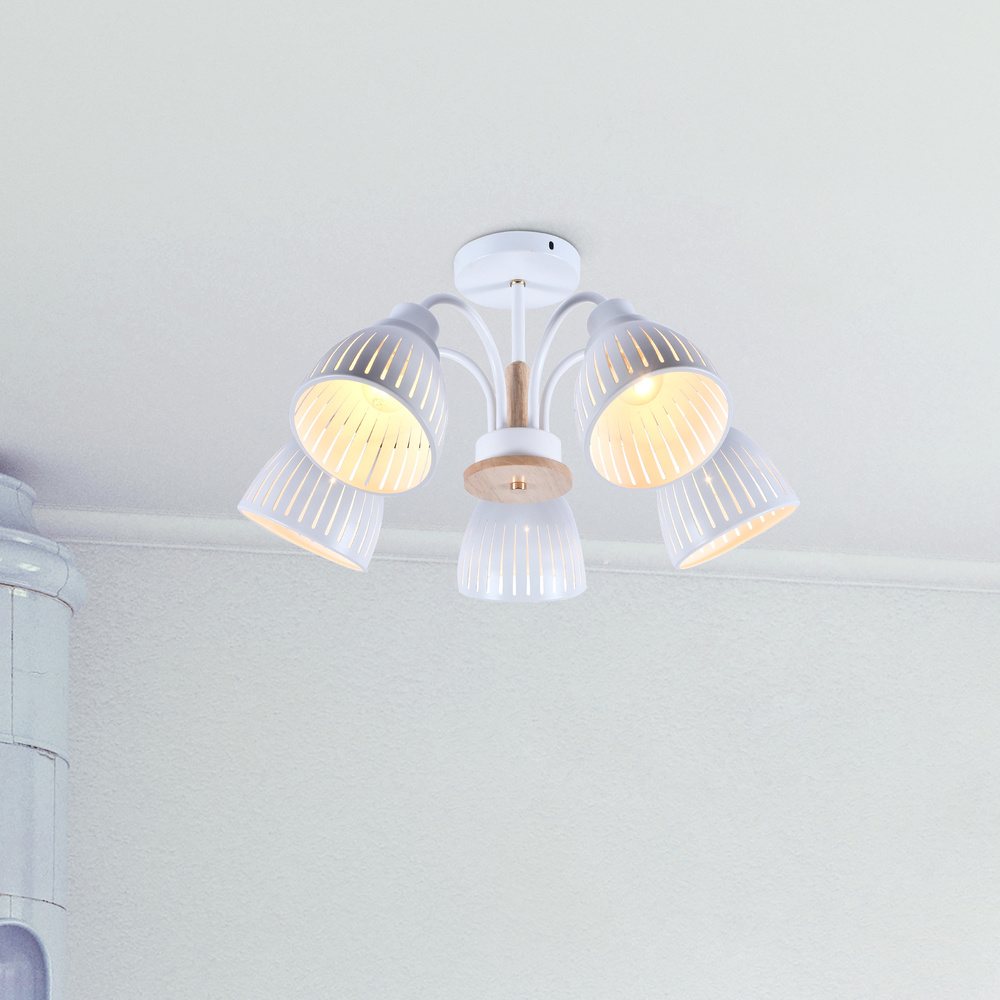 Белый металл и светлое дерево одно из самых актуальных сочетаний, которое идеально смотрится на кухне, в гостиной, столовой, в спальне, коридоре, холле. Rivoli Lulu часто выбирают для квартир-студий, кафе, гостиниц. Перфорация на плафонах визуально облегчает прочную металлическую конструкцию, а золотистые элементы придают изюминку базовым цветам и формам. Коллекция представлена потолочной люстрой на 5 ламп.