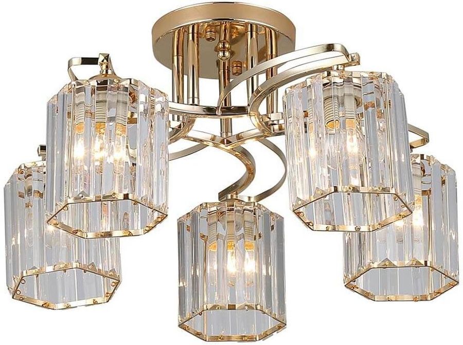 Хрустальная 5-рожковая люстра на потолок Rivoli Angelina прекрасно дополнит классический интерьер и станет украшением вашего дома. Такие красивые люстры привлекают к себе внимание и собирают положительные отзывы. Кристально-чистые фигурные плафоны люстры, прозрачные, со стильным рифлением, изготовлены из высококачественного хрусталя. Прочная металлическая арматура отличается оригинальными формами и стойким гальваническим покрытием теплого золотого цвета.