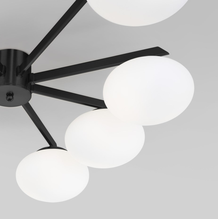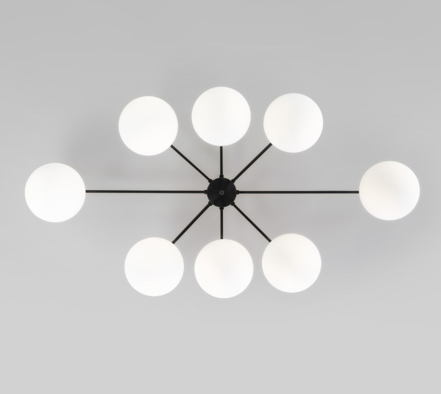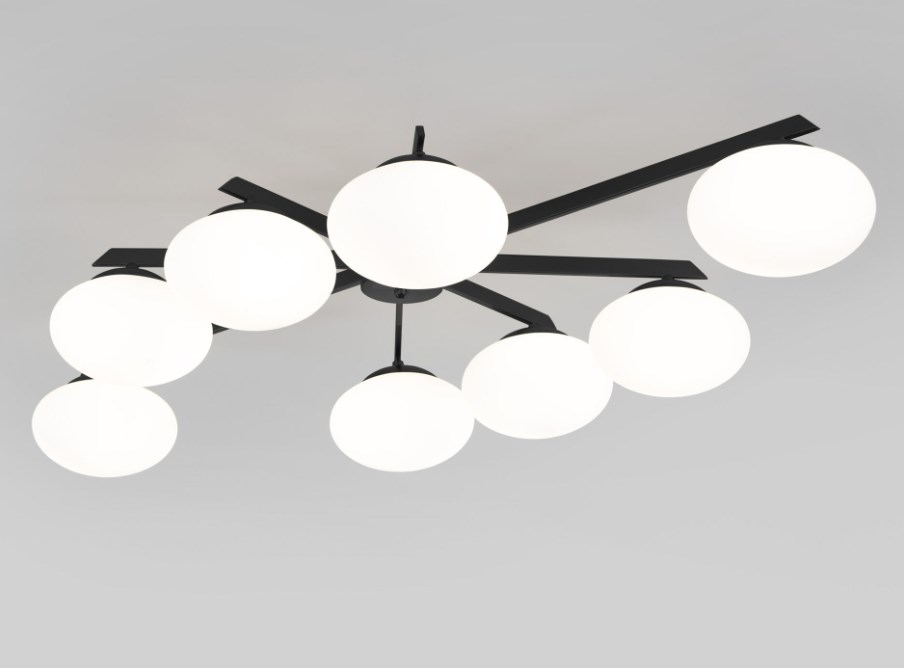 Организовать качественное освещение вам поможет эффектная потолочная люстра со стеклянными плафонами в чёрном цвете. Простые эргономичные формы и умеренные тона станут прекрасным дополнением для вашего интерьера. Люстра украсит потолок вашей спальни и создаст полноценное освещение на площади 10 м². В люстре рекомендуется использовать сменные лампы накаливания с цоколем G9 с максимальной мощностью 20 Вт. В производстве люстры использовали высококачественный металл с надежным защитным покрытием и закаленное стекло.