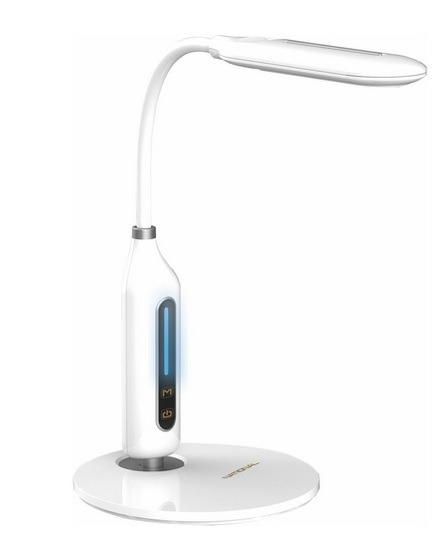 Высокотехнологичная настольная лампа в стиле хай-тек идеально подойдет для оснащения рабочего места школьника или домашнего офиса. Модель выполнена из белого пластика и украшена декоративным металлическим кольцом. Удобное сенсорное управление, шкала регулировки яркости излучения, расположенная на корпусе, поворотный плафон на гибком держателе, возможность выбора цветовой температуры и функция ночника позволяют использовать лампу для самых разных целей: чтения, письма, работы за компьютером, рукоделия и вечерней подсветки. Встроенный LED-модуль со сроком службы до 50000 часов не нуждается в замене. Потребляемая мощность светильника 8 Вт, световой поток 500 Лм.