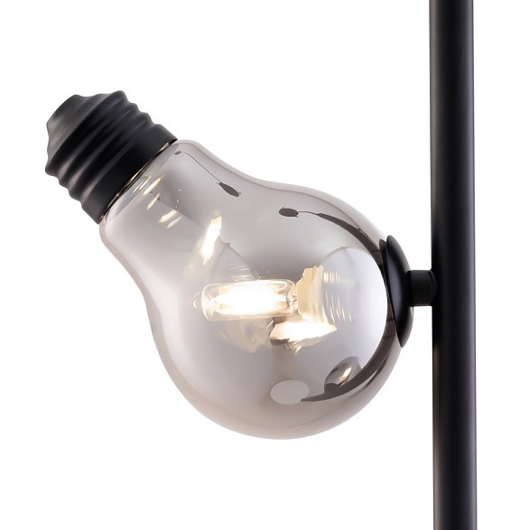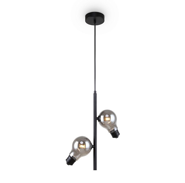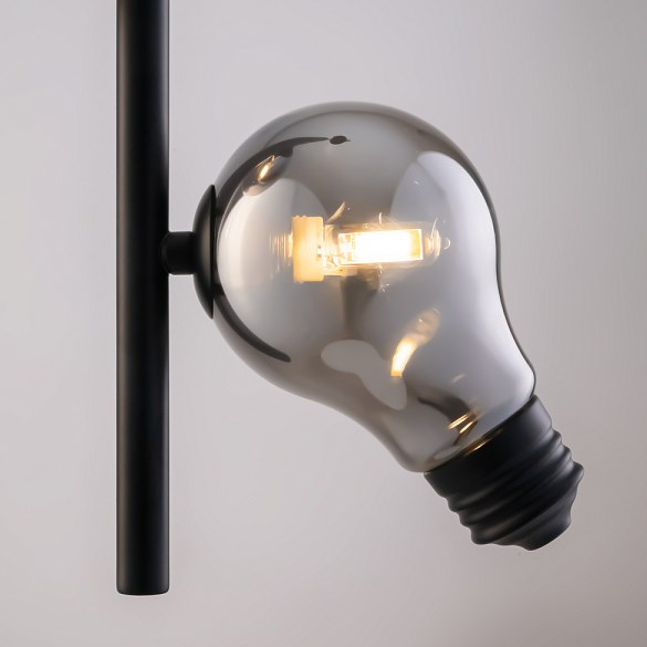 Металлическая арматура, цвета — чёрный и латунь. Прозрачные плафоны-лампочки из стекла в тон арматуры хаотично “разбросаны” по острову светильника. Подвесы регулируются по высоте.