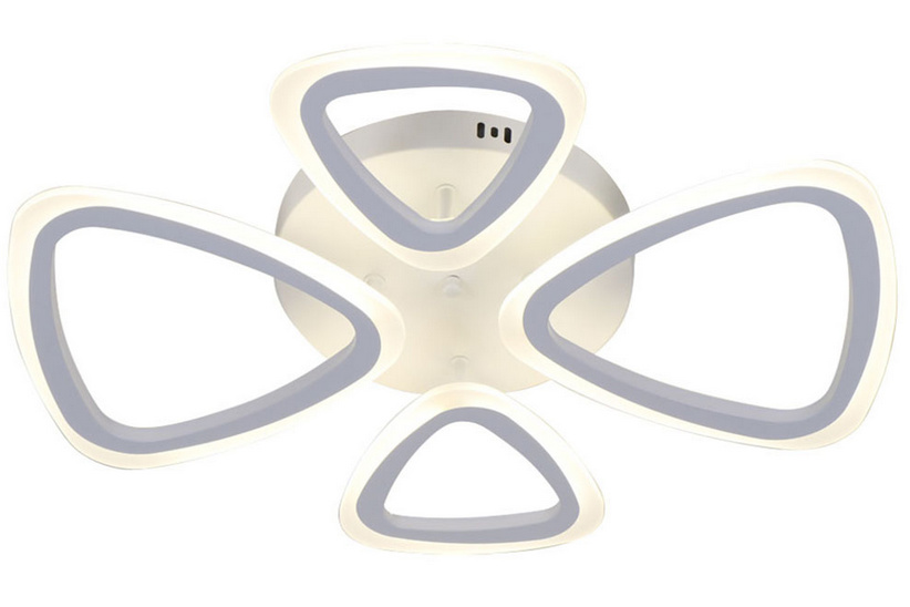 Светильник изготовлен в белом матовом цвете на круглом металлическом основании с четырьмя плафонами, дополненными акриловыми вставками по внешней части.
