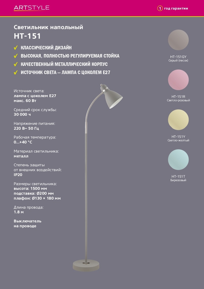 Стильный торшер HT-151 украсит интерьер, оформленный в любом стиле. Качественный металлический корпус. Высокая регулируемая стойка позволяет менять высоту плафона в широком диапазоне. Торшер можно использовать с любыми типами ламп с цоколем Е27, в том числе со светодиодными мощностью до 60 Вт (лампочка в комплект не входит). Длина провода 1,8 метра, выключатель на проводе. Высота торшера 150 см, диаметр подставки 20 см, размер плафона 13х18 см.