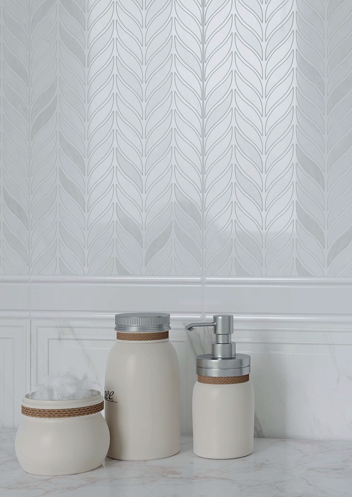 Total white — это совершенная классика, которая впишется в любое стилевое решение. Сияющий белый стал базовым цветом в коллекции "Леона", а оттеняет его благородный серый мраморных прожилок. Декоративные плиты украшены сочетанием геометрического и растительного орнамента, причем обрамление листьев материалом, создающим микрорельеф, придает поверхности глубину и интересную игру бликов. Рельеф "буазери" на мраморных вставках, плинтус и бордюр позволяют легко формировать вертикальную выкладку и могут стать визуальными акцентами в интерьере.