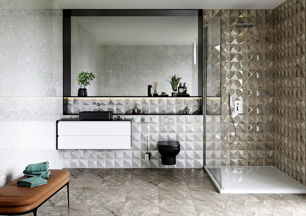 Российская коллекция керамической плитки Axima Нормандия уникальный материал для дизайнерских решений. Строгий, современный и исключительно элегантный стиль коллекции подкупает своей неповторимостью. Керамическая плитка выпускается на необычном рельефном штампе. Общая площадь поверхности плиток разделена на шесть квадратов, на каждом из которых четыре треугольника с разной величиной сторон образуют уплощённую пирамиду. В результате того, что свет отражается от объёмных фигур под разным углом возникает нетривиальный эффект оживления поверхности. Основа рисунка коллекции серо-бежевый мрамор с выраженной структурой.