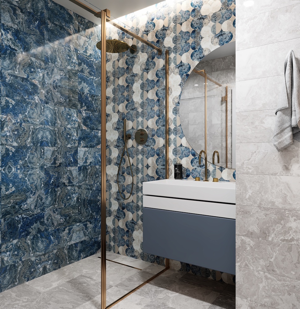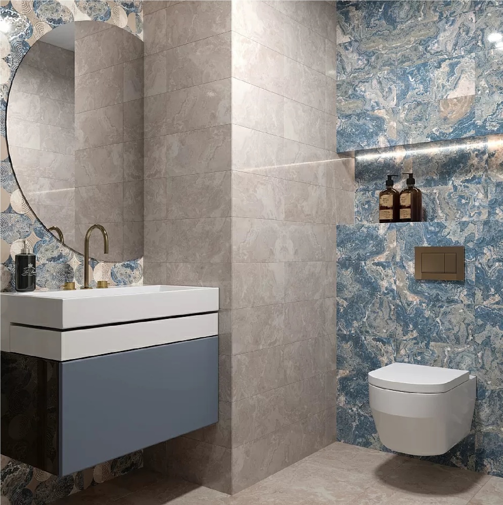 Глянцевая коллекция крупноформатной керамической плитки «Ричмонд» создана в двух актуальных цветовых решениях: кофейно-коричневом и сине-голубом. Фактура основы стилизована под камень и дополнена универсальным геометричным декором. Яркий космический дизайн с эффектом золота и платины впечатлит даже самых взыскательных клиентов. Керамическая плитка в синем оттенке позволяет добиться в интерьере эффекта глубокого, завораживающего, футуристичного пространства. Тогда как бежево-коричневый вариант исполнения вносит в интерьер теплые, сдержанные, благородные ноты. Коллекция – магнит, коллекция – вызов, отражающая самые актуальные тенденции, и, вместе с тем, способная создавать дизайн «вне времени и моды»