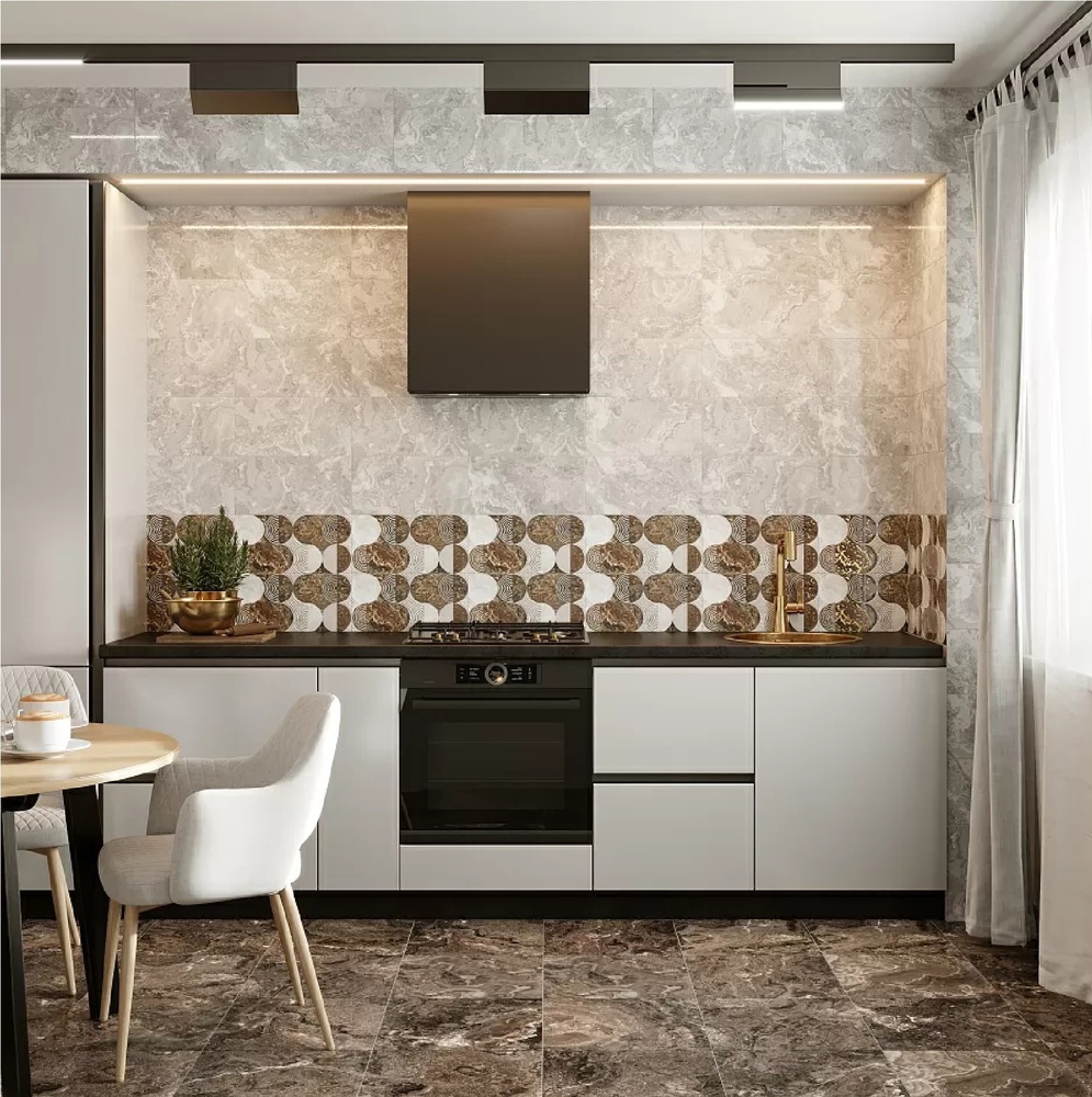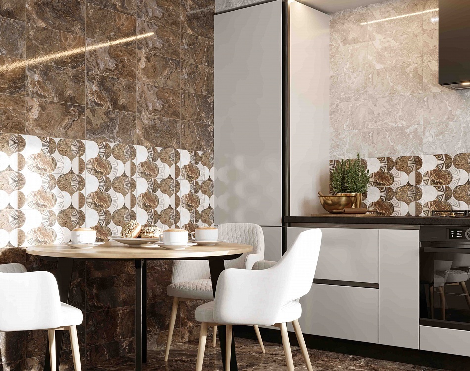 Глянцевая коллекция крупноформатной керамической плитки «Ричмонд» создана в двух актуальных цветовых решениях: кофейно-коричневом и сине-голубом. Фактура основы стилизована под камень и дополнена универсальным геометричным декором. Яркий космический дизайн с эффектом золота и платины впечатлит даже самых взыскательных клиентов. Керамическая плитка в синем оттенке позволяет добиться в интерьере эффекта глубокого, завораживающего, футуристичного пространства. Тогда как бежево-коричневый вариант исполнения вносит в интерьер теплые, сдержанные, благородные ноты. Коллекция – магнит, коллекция – вызов, отражающая самые актуальные тенденции, и, вместе с тем, способная создавать дизайн «вне времени и моды».