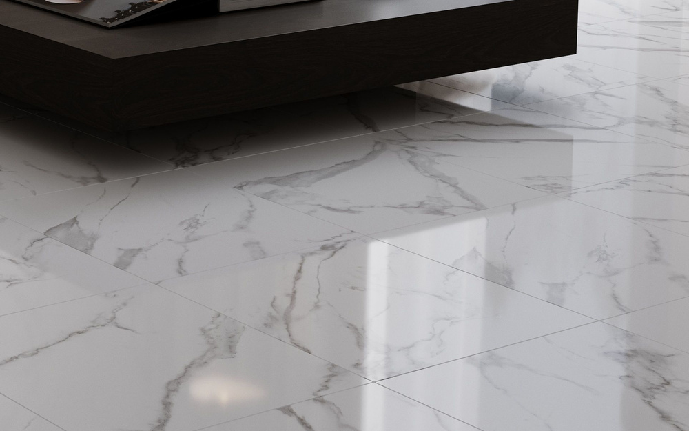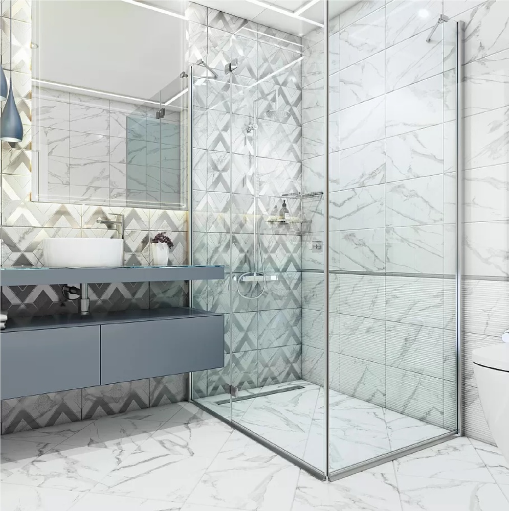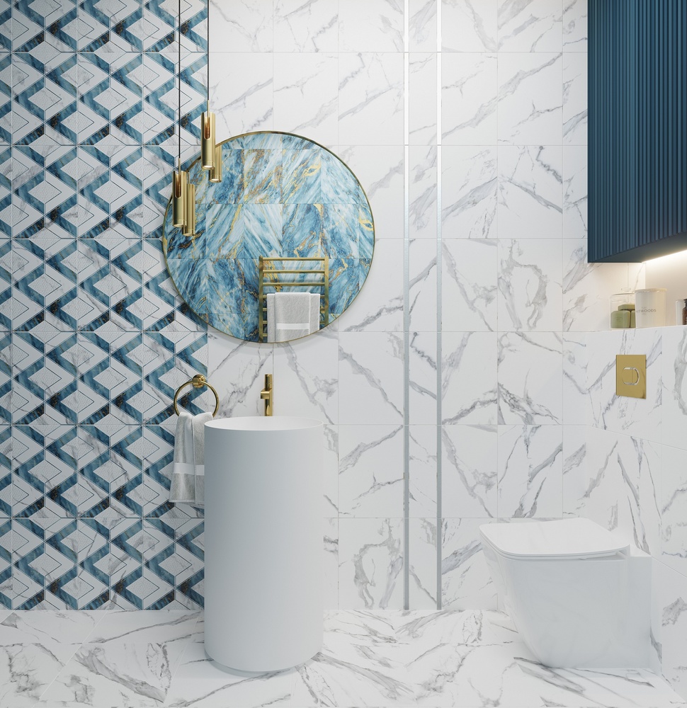 С коллекцией «Виченца» можно создать светлый интерьер, используя только белый мрамор. Акцентом в данном случае будет выступать рельефная поверхность, создающая объем и световые блики в помещении. Визитная карточка коллекции – эффект среза камня, имитирующего золотые прожилки на яркой базовой плитке.