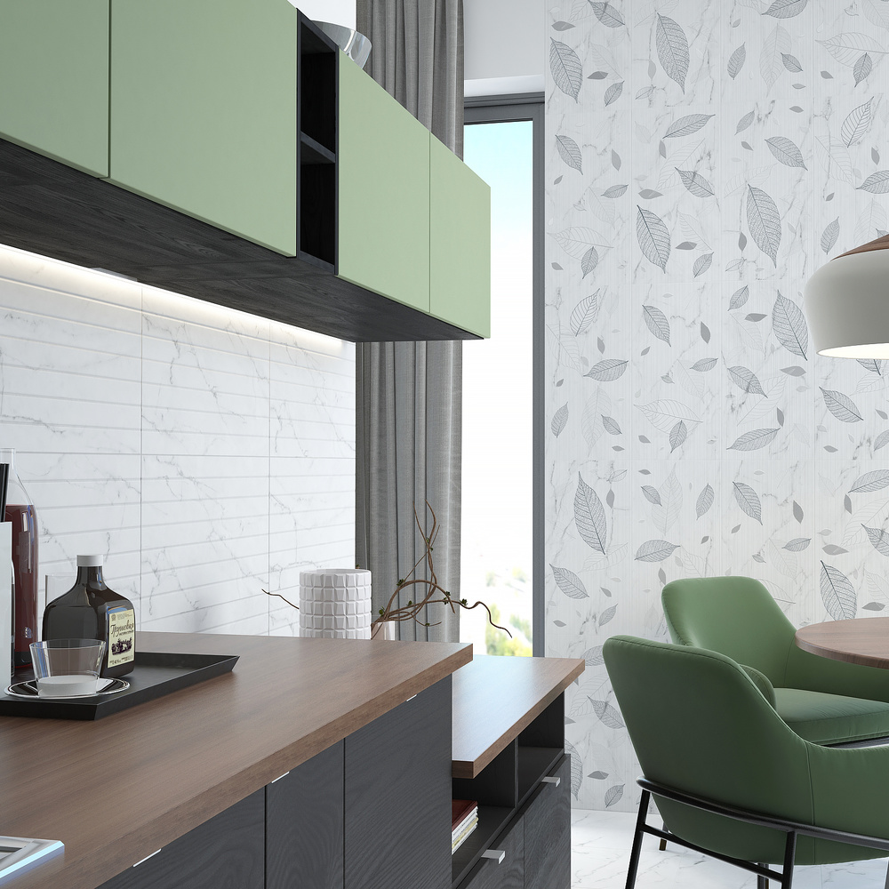 Бархатистая и гладкая, приятная на ощупь «мягкая» плитка для стен 600х300 мм, покрытая сатинированной глазурью, напоминает чистый лист, на котором в причудливом узоре сплетаются слова. Коллекция состоит из базовой плитки с фактурой белого каррарского мрамора и двух вариантов декора: с растительным узором, выполненным по технологии Digital Glue, а также с дизайном из параллельных реек – для ценителей изысканной простоты.