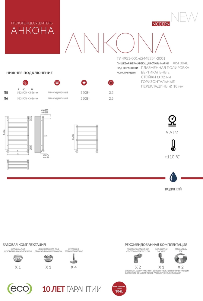 Водяной полотенцесушитель Анкона с полкой – изящная модель, которая украсит интерьер ванной комнаты, поддержит идеальную температуру в помещении. Высота изделия варьируется в пределах 616–826 мм. Для производства полотенцесушителя используется только высококачественная нержавеющая сталь марки AISI 304L с высоким содержанием легирующих элементов, Ni и Cr, это позволяет изделиям сохранять стойкость к агрессивным коррозийным средам, что существенно продлевает срок их эксплуатации. Толщина стенки используемой трубы не менее 2 мм, это обеспечивает 10-ти кратный запас прочности, труба устойчива к резким перепадам давления в системе водоснабжения!