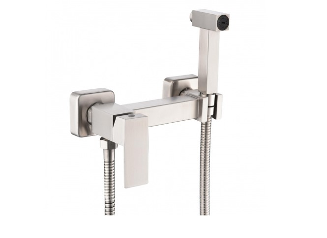 В комплекте: смеситель со встроенным держателем, гибкий шланг, гигиенический душ с кнопкой включения/выключения потока воды, отражатели.