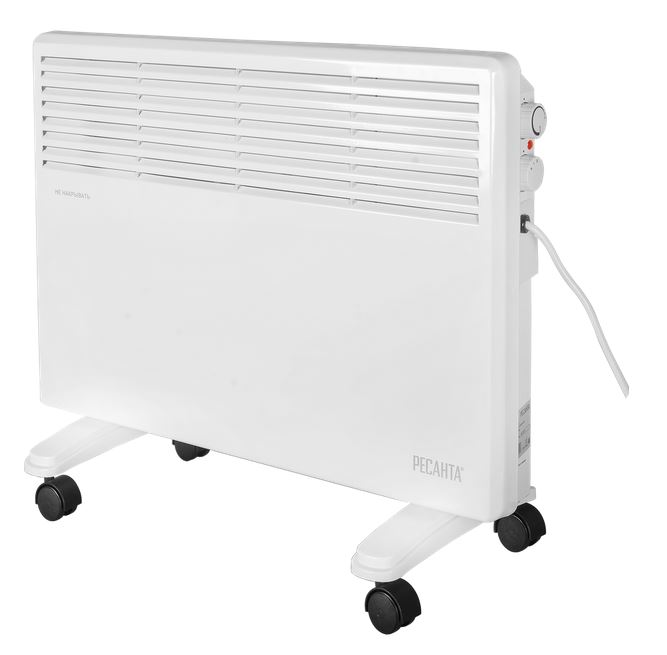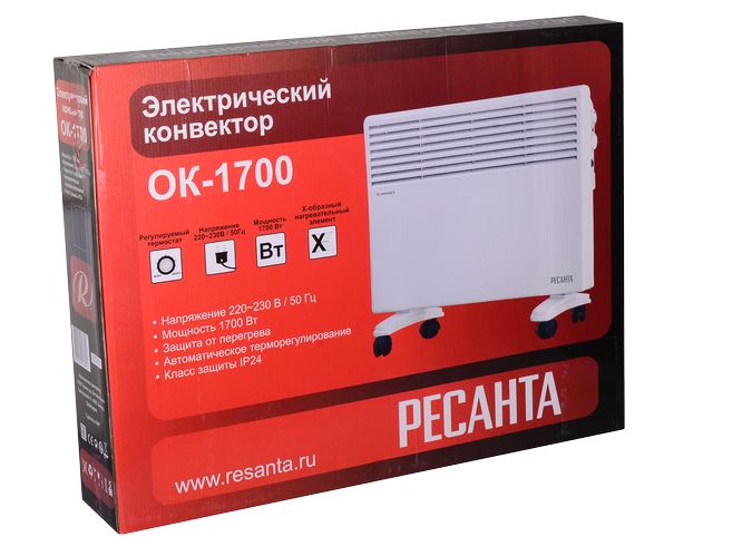 Конвектор Ресанта ОК 1700 оснащен механическим термостатом для установки и поддержания нужной температуры обогрева. Предусмотрено два режима работы: 850/1700 Вт. Для напольной установки конвектор укомплектован опорными ножками.